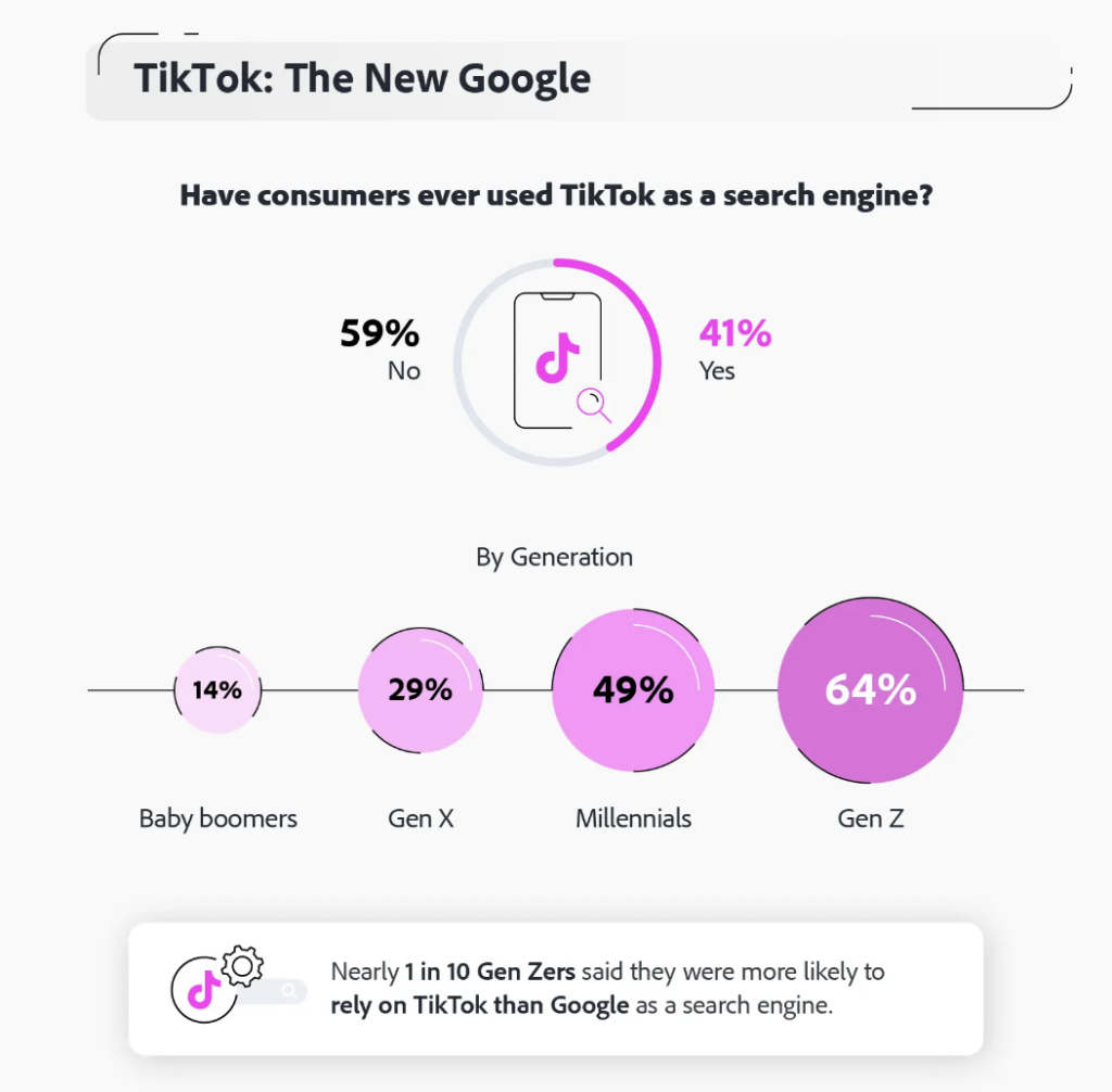 - The same study says TikTok search is being driven less by traditional keyword behavior and more by its short video format, storytelling, and interactive experience. (Adobe)